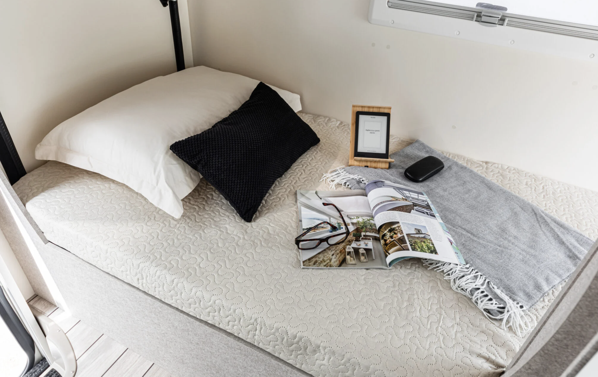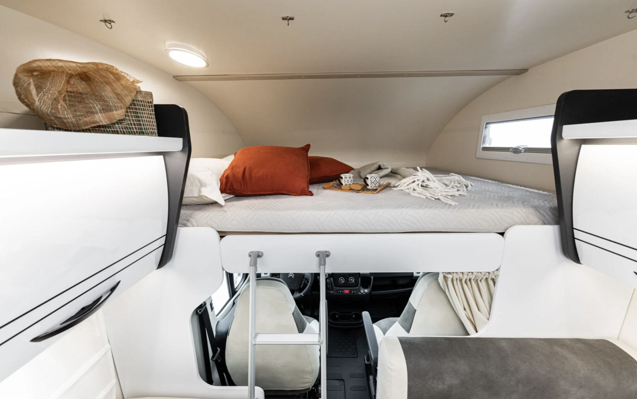 Podréis dormir en una cama capuchina, dos literas en la parte trasera y camas convertibles en salón y dinette.