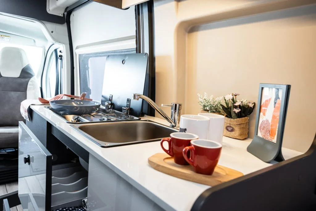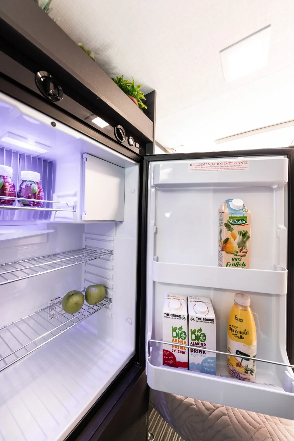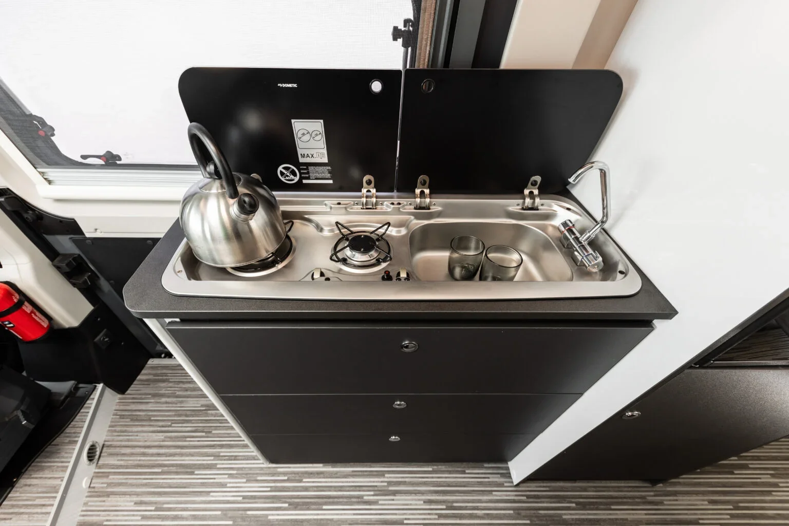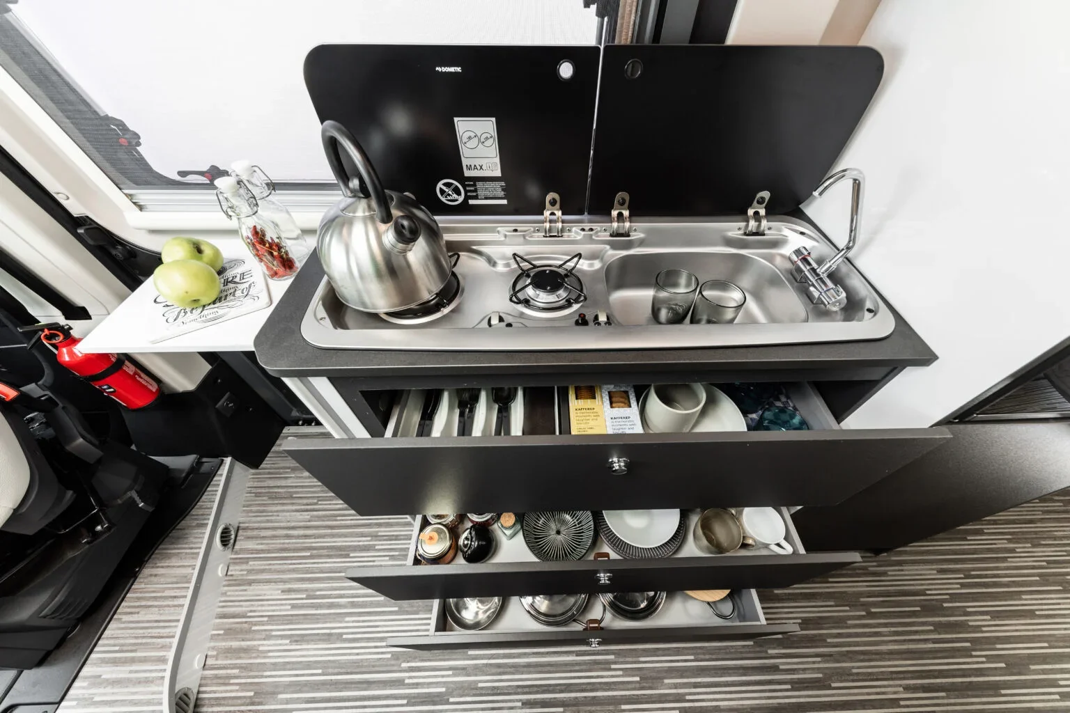 La cocina lineal con placa de cocción con 2 fogones ofrece amplios espacios de almacenamiento bien organizados: tres cajones espaciosos y un mueble alto con luz LED táctil integrada garantizan el orden y la funcionalidad. El frigorífico de compresor de 84 litros, que se puede abrir hasta 180°, es la solución ideal para comidas y aperitivos al aire libre, haciendo que cada parada al aire libre sea aún más agradable.o.
