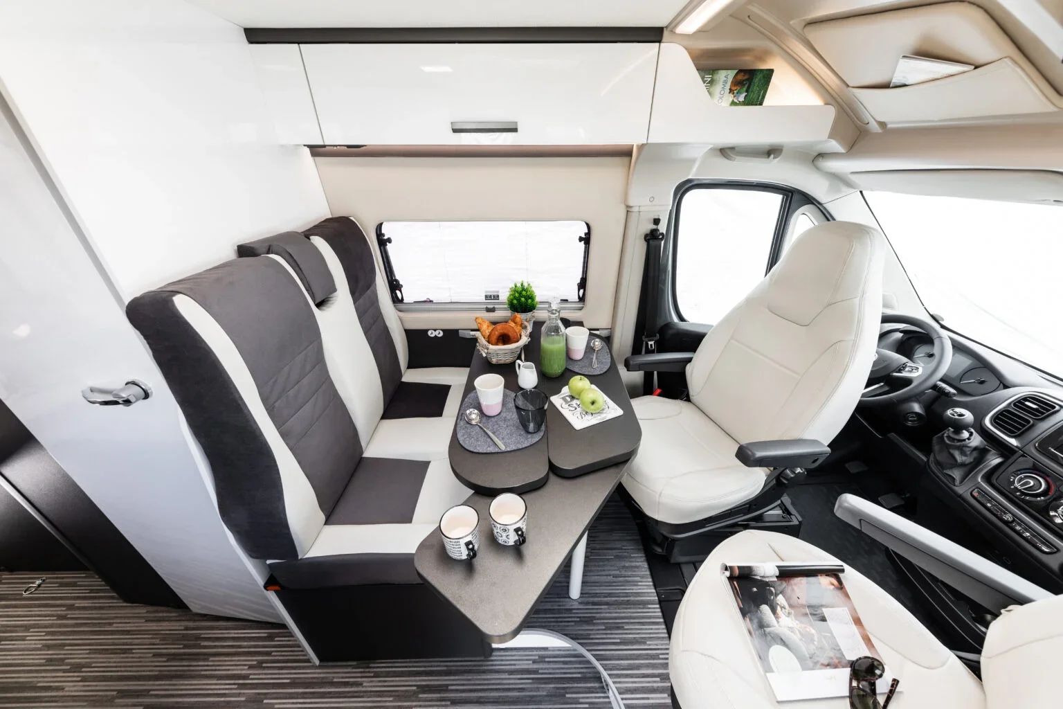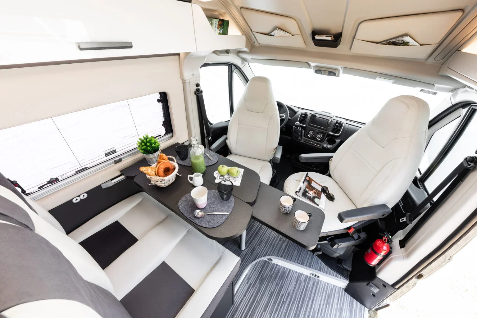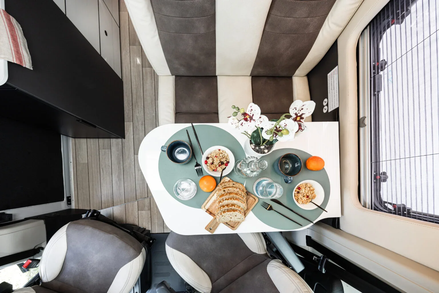 La mesa ergonómica con extensión ofrece versatilidad de uso, ideal para comer o trabajar tanto dentro como fuera del vehículo. Para completar el espacio, soluciones inteligentes para la organización: un armario colgante, un porta sombreros sobre la cabina, compartimentos portaobjetos y prácticos portavasos hacen que cada viaje sea aún más cómodo y ordenado.