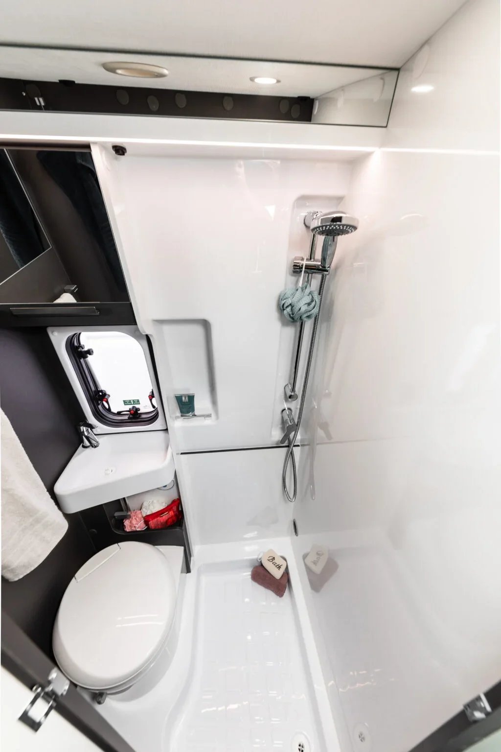 El baño con ducha integrada pero separada mediante una mampara está diseñado para maximizar el aprovechamiento del espacio, ofreciendo soluciones prácticas y un ambiente confortable. Su deposito de Agua caliente de 90L. Espacio de almacenamiento óptimo, la estantería abierta aprovecha al máximo el espacio disponible, mejorando al mismo tiempo la habitabilidad y la estética del ambiente. Dispone de de Ventana en el WC.